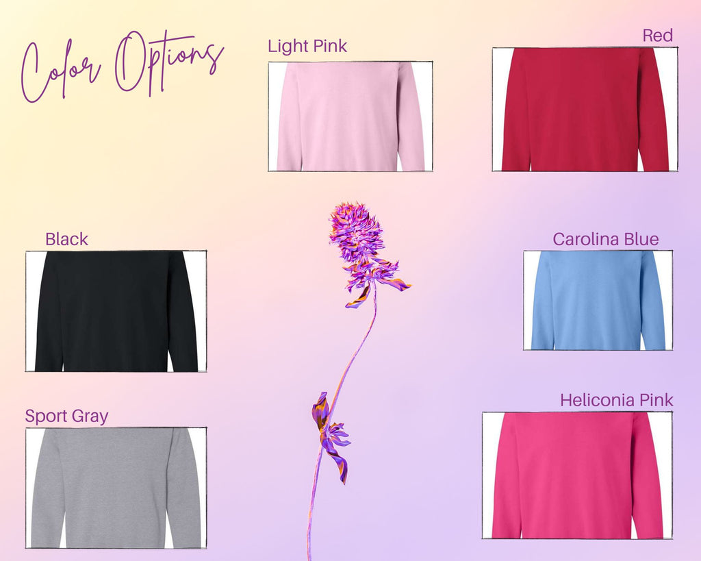 Available in sizes Small to 3XL with a unisex fit. You may choose your letter color choice (black or white); however, black sweatshirts are offered with white letters (as shown in cover photo).